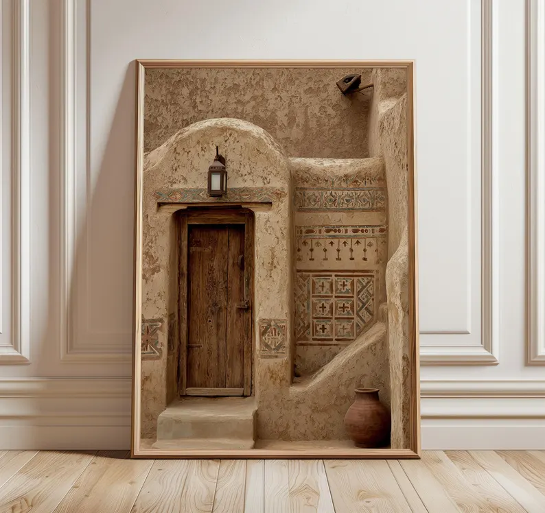 This Berber doorway print captures the timeless beauty of Moroccan desert architecture, showcasing a weathered wooden door set in sun-baked adobe walls with hand-painted geometric motifs. The earthy textures and warm clay tones evoke a sense of history, craftsmanship, and quiet simplicity. A terracotta pot and vintage lantern complete the rustic scene, creating an inviting blend of tradition and charm. Perfect for bohemian, Mediterranean, or minimalist interiors, this artwork adds warmth, authenticity, and global character to any space.